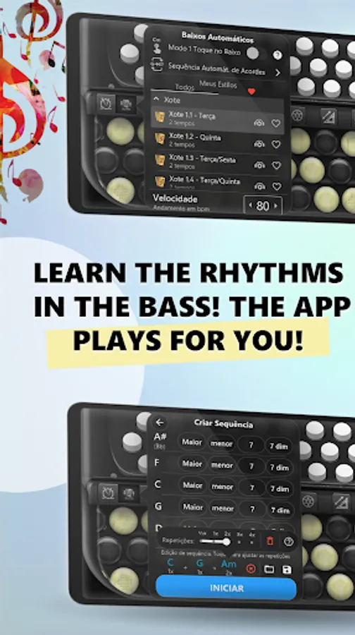 Learn about the accordion basses with our unique system of "Automatic Rhythms" - With this you can make a sequence of chords, choose a rhythm, and the application will automatically execute it on the accordion basses, while so you can train their melodies and harmonies, and can learn new rhythms in the accordion basses, all with compass measurement at the correct time.