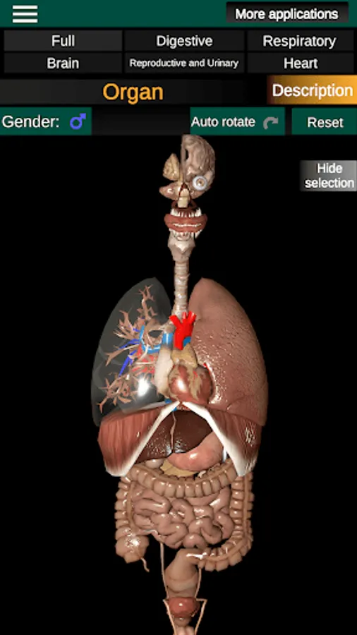 Shows a 3D anatomical model of the main organs of the human body and a description of each one.