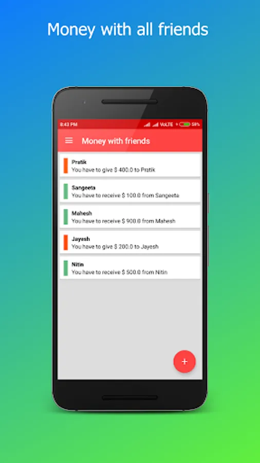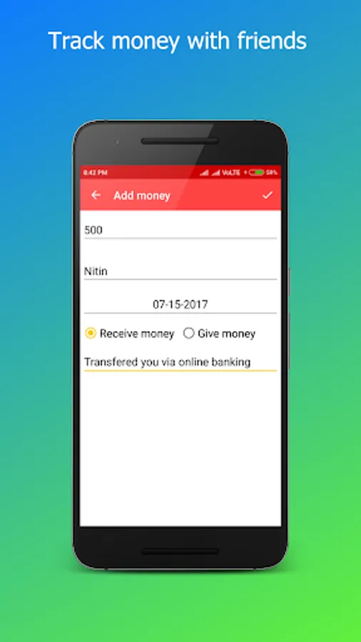 User can add friends money via this app. i.e. If you have to give/receive some amount to/from your friend you can simply add money transaction with that friend. You can add any number of transactions with same friend. This app automatically calculates how much money you have to give/receive from that friend at the end.