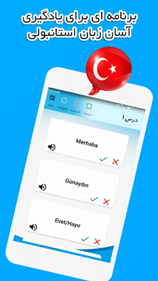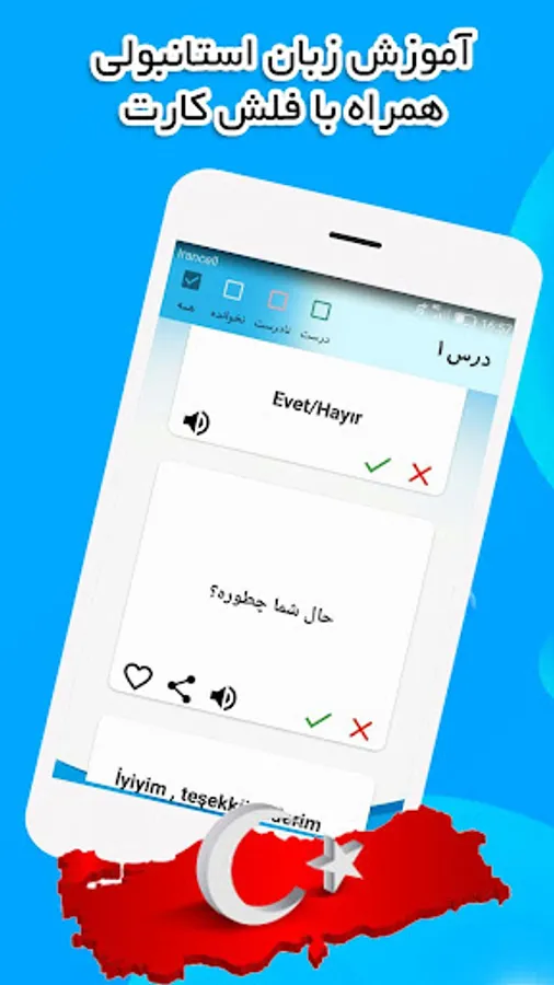 Turkish language flashcard is the complete reference for learning Turkish for those who are interested in learning Istanbul Turkish. The simple yet practical design of the Turkish language flashcard allows you to learn Istanbul Turkish as easily as possible. The Turkish language flashcard simplifies the learning of Turkish Turkish language words by categorizing words in the form of lessons and smart filtering to determine the correct and incorrect answers.
