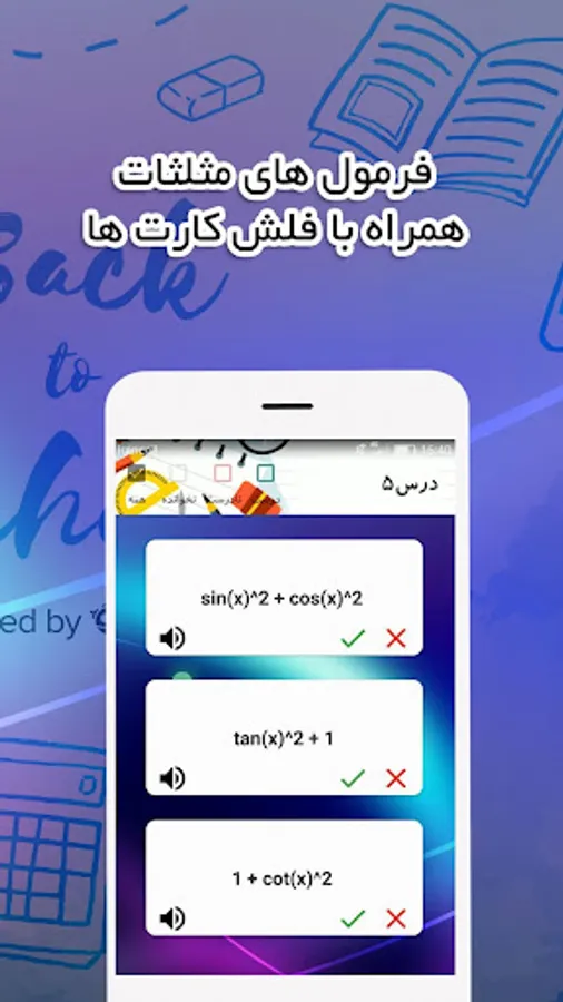 Flashcard Triangle Formulas is a simple and comprehensive application for learning, memorizing and memorizing trigonometric formulas. The simple yet practical design of the Triangle Formula Flash Card allows you to effectively learn and memorize formulas. The flashcard for triangular formulas simplifies the learning of formulas by categorizing the formulas into lessons and smart filtering to determine the correct and incorrect answers.