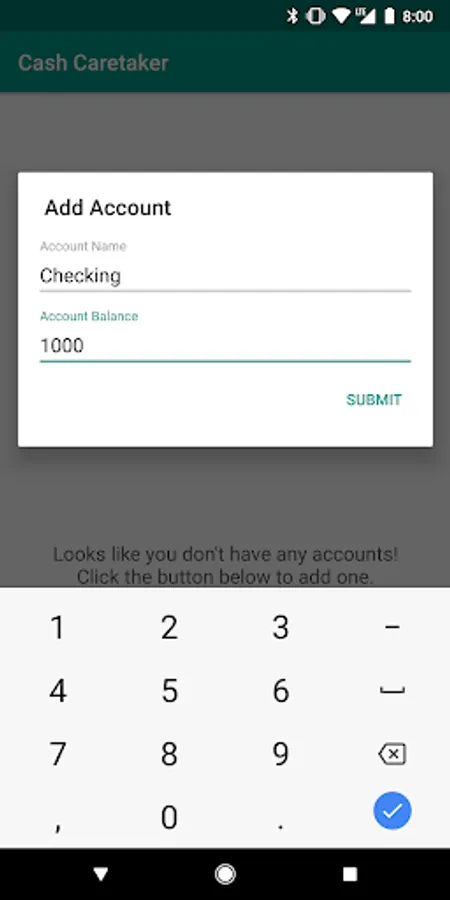 All information for Cash Caretaker is entered by the user, and stored locally on the device. This app is not tied to your actual bank accounts in any way.