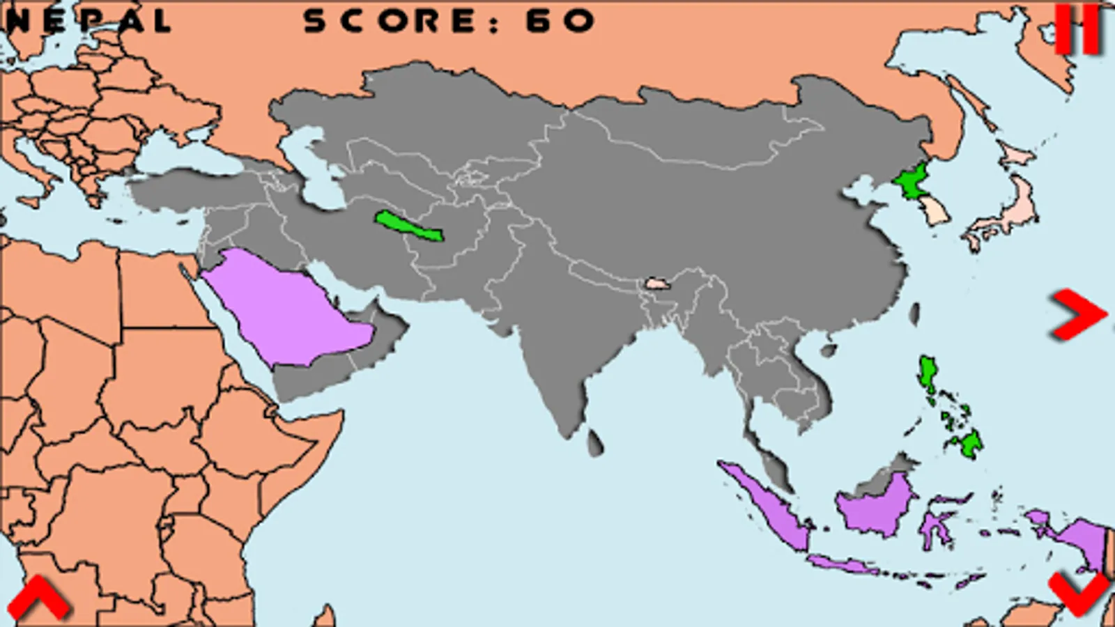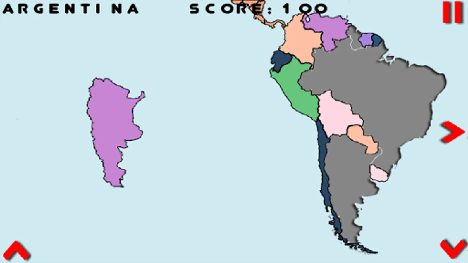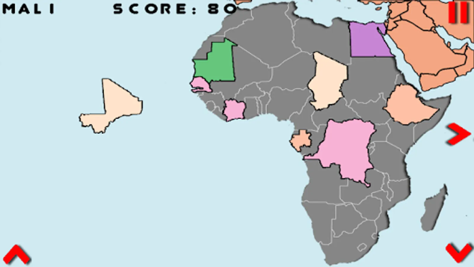 Map puzzle. Learn geographical locations of countries. Locate the moving country on the continent by arrows or touching upper and lower half of the screen or using drag and drop. In training mode you can select the continent. In play mode 5 continents appear randomly and moving speed increases.
