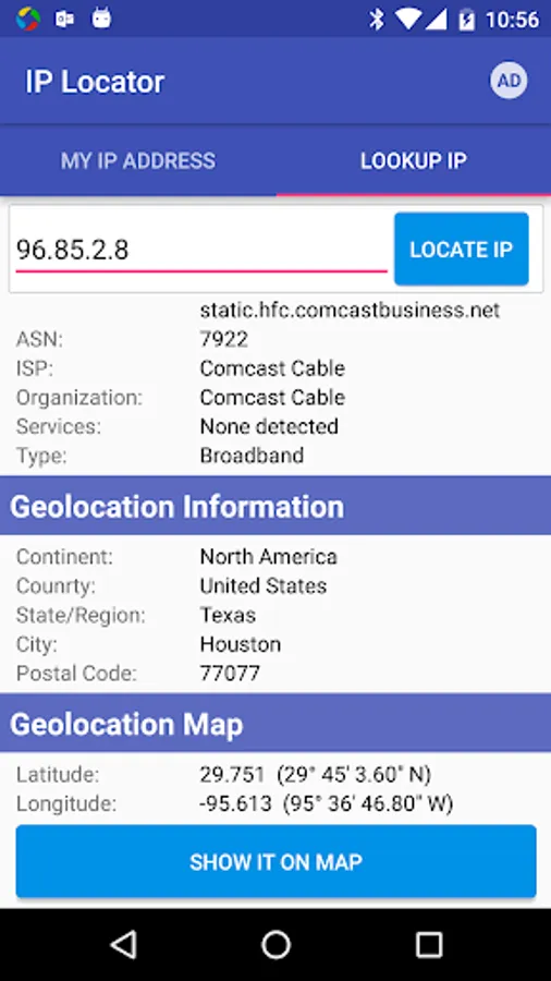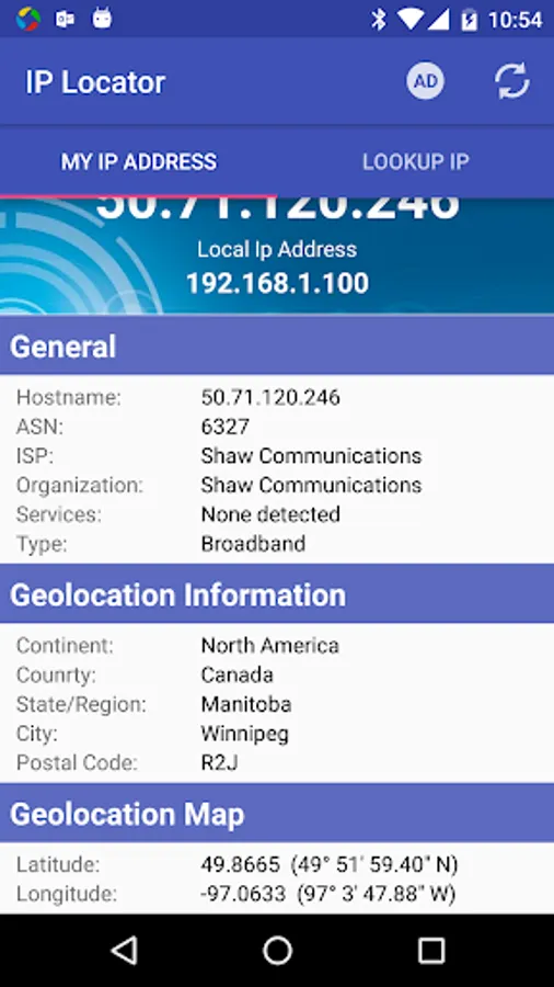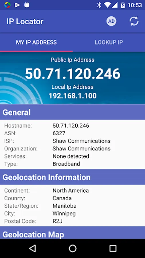 IP Locator is an easy tool used to locate IP addresses and show IP location on a geographic map. This app displays the city and country where the IP/Website is located. It will also show the current Internet Supplier of the IP address.