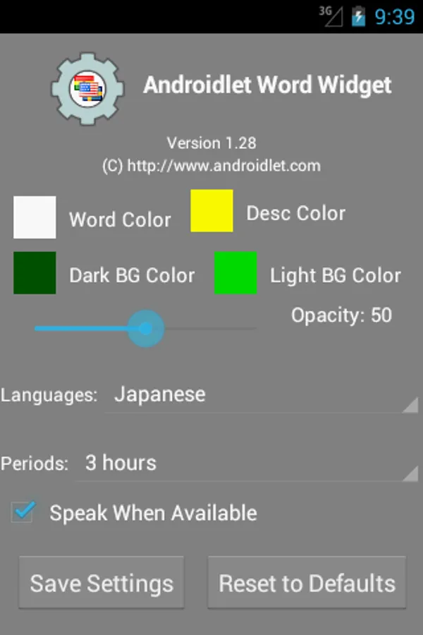 * 2x1 widget (long-press on Android device to select from widget menu) to display words of chosen languages with English description