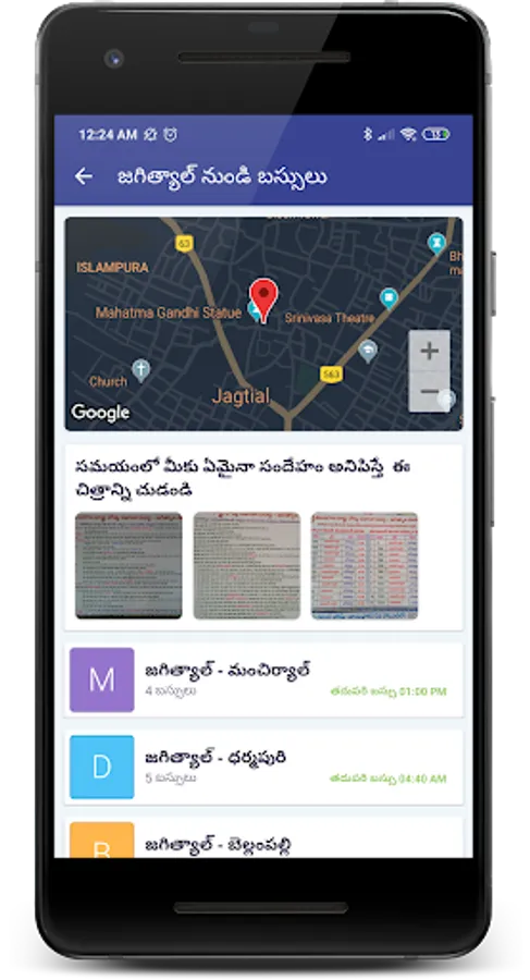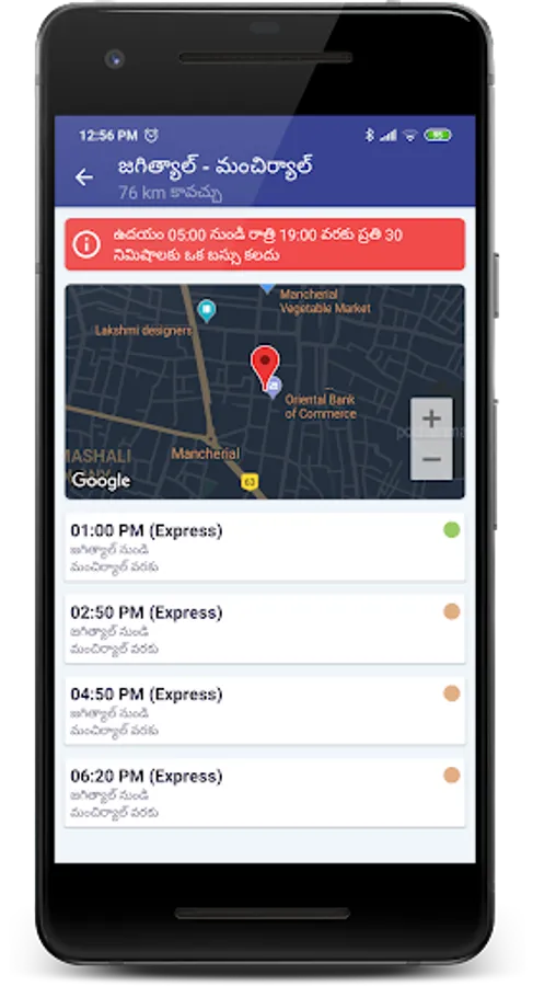 బోధన్, నిజామాబాద్, ఆర్మూర్, మెట్పల్లి, కొరుట్ల, వేములవాడ, కరీంనగర్, జాగిషియల్ వంటి డిపోల నుండి లోకల్ మరియు ఎక్స్ప్రెస్ బస్సు సమయం
