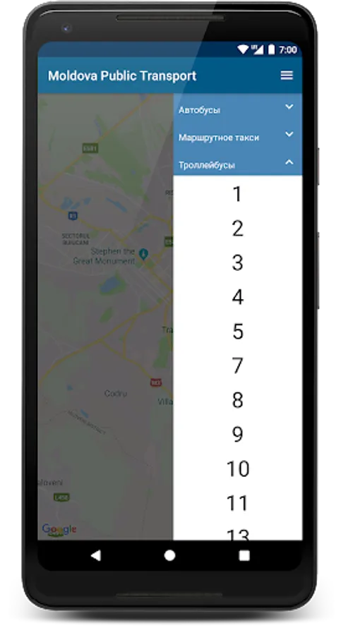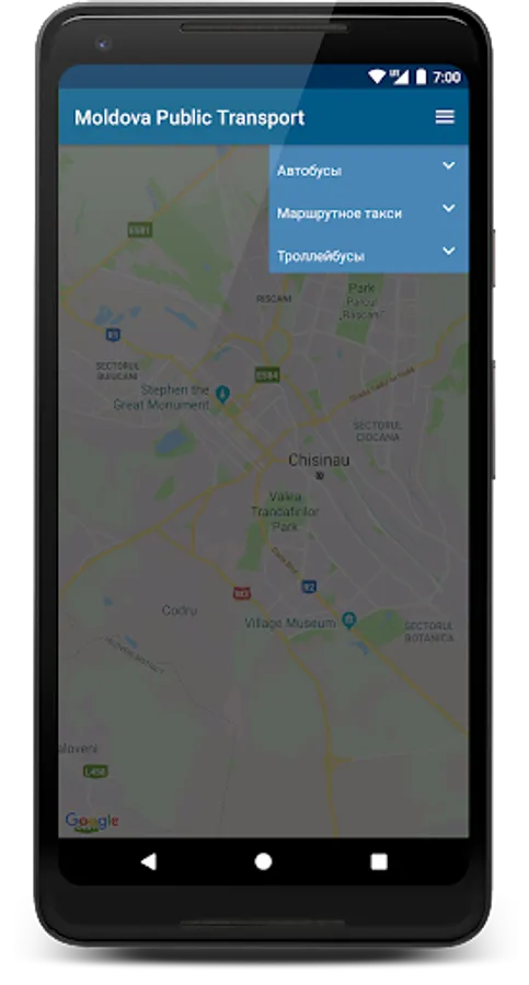 Moldova Public Transport it's a free map application based on Google maps API, with public transportation routes, new taxi service phone numbers (tap to make a call), region based search.