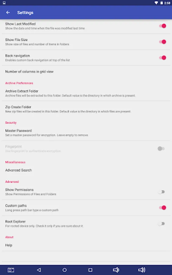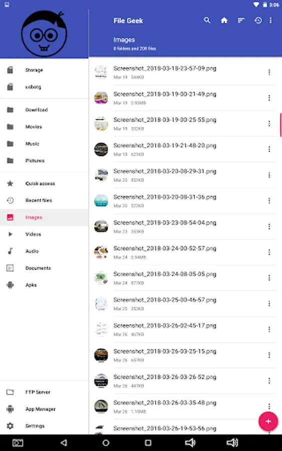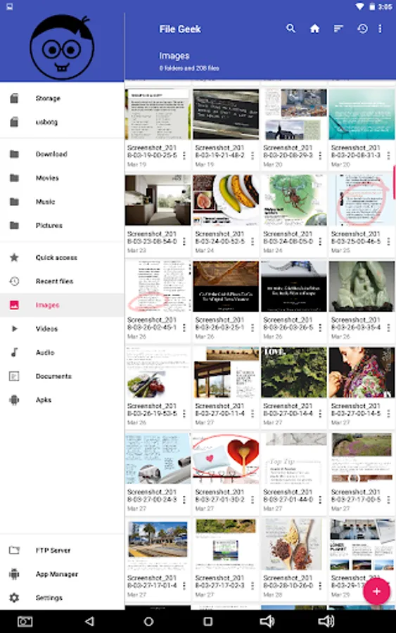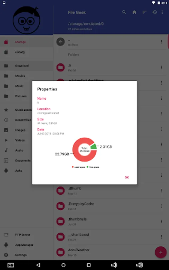File Geek is an advanced file manager and explorer which allows the Android user to browse and modify all the files on the Android device, including hidden ones and without all the annoying ads or in-app purchases that most other file managers have. File Geek allows the user to easily open, rename, cut, copy, move, delete, encrypt, share, or view properties of files as well as create new folders and files. File Geek also allows the user to customize the app colors to the users liking and offers many other customizable options and built-in tools. File Geek gives the user Quick Access to all Images, Videos, Audio, Documents, Recent Files, and APKs on the Android device. File Geek has a built in search feature allowing the user to quickly search the device to find and access files. File Geek shows the last time the file was modified and the file size.