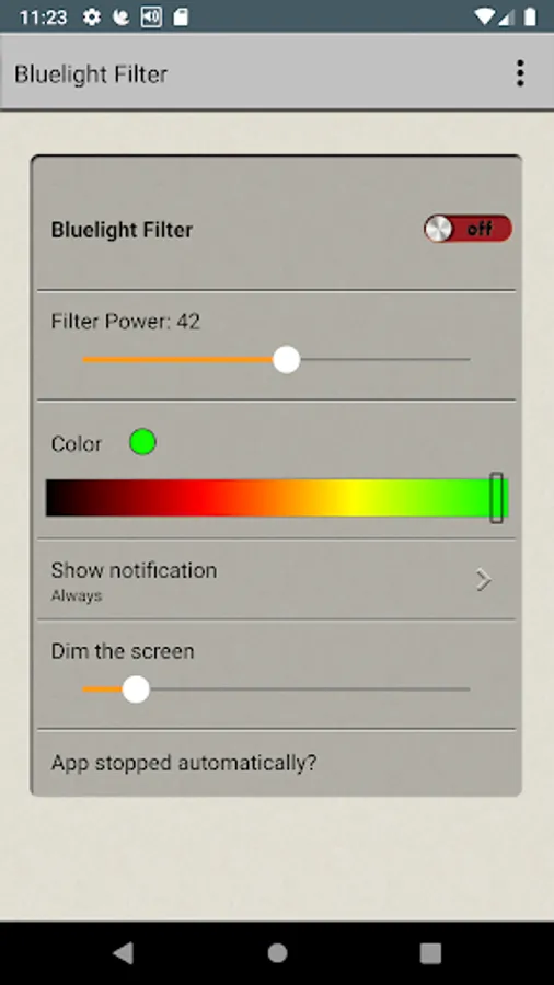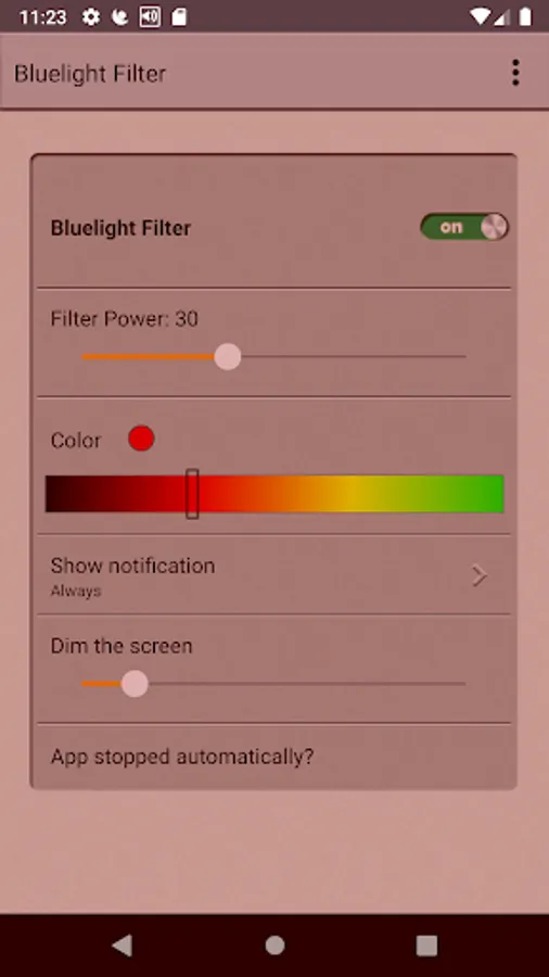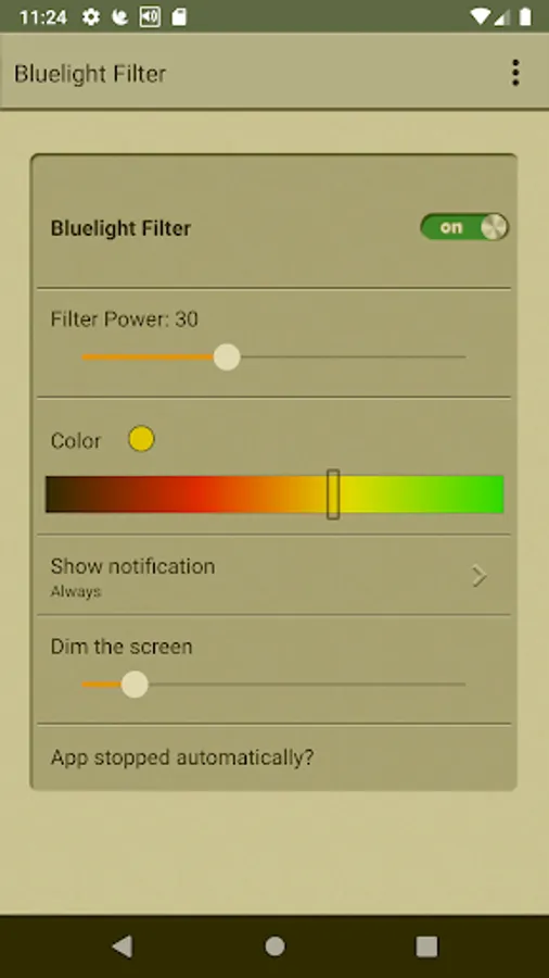 Bluelight from the screens of your mobile phones and tablets could be harmful to your eyes. This app can reduce the Bluelight by changing the color of your screen. It is recommended to turn on this app when you are reading or playing games especially in a dark room. This app is light-weighted and stable, cost very little memory and CPU resources.