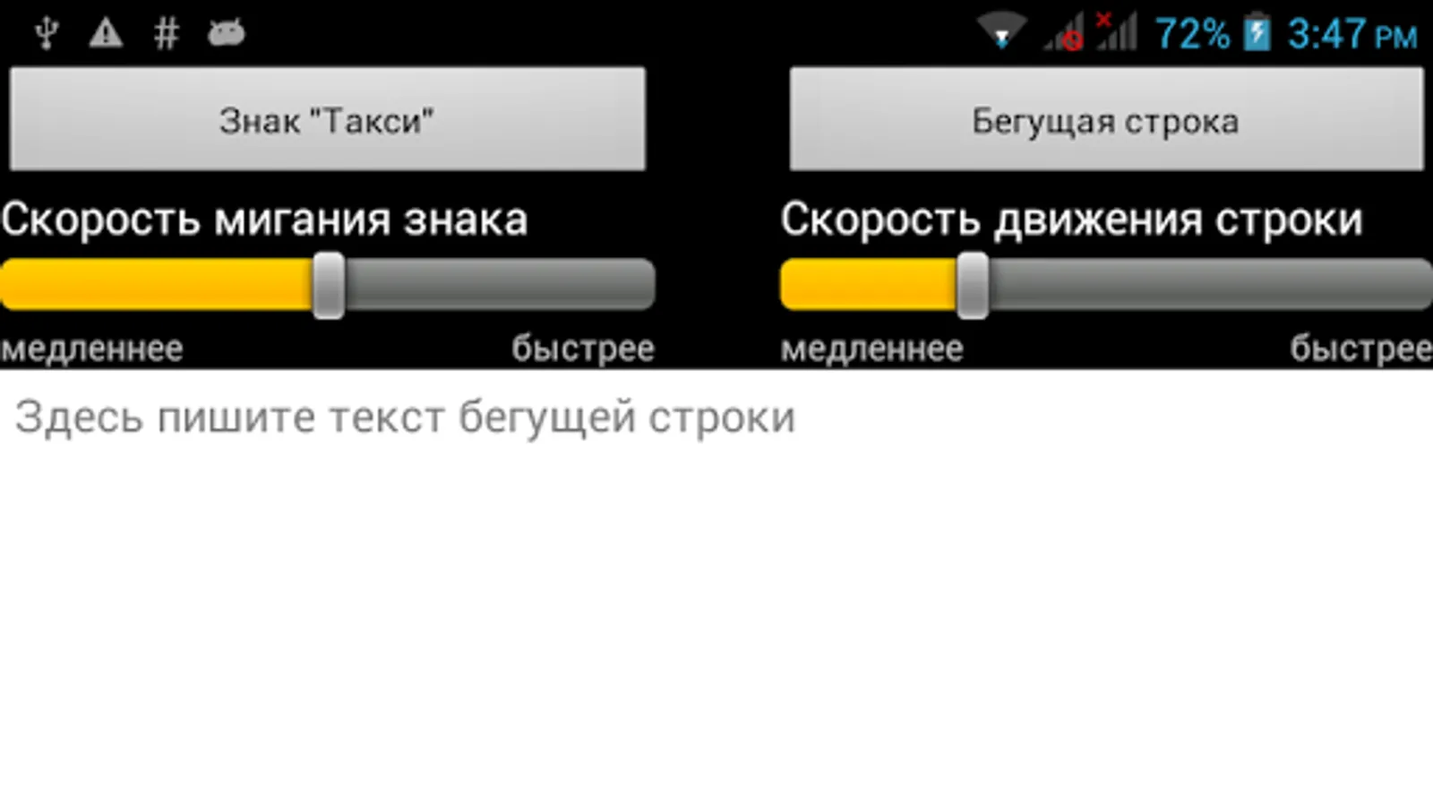 The app allows you to turn your phone or tablet into a flashing znachёk "Taxi" (checkered) or used as a small news ticker with the necessary information.