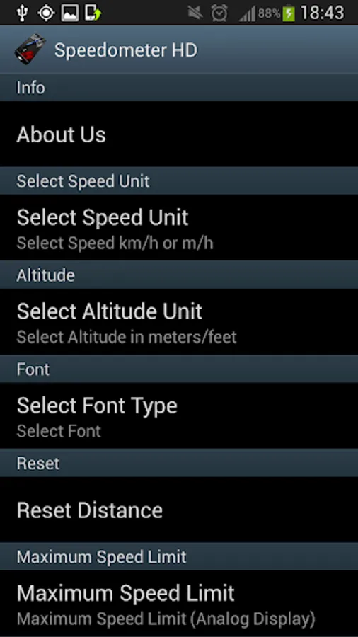 Displays your current speed in either Miles per Hour or Kilometers per Hour. Displays your top speed achieved. Use to accurately find out how fast you are going using your device's GPS.