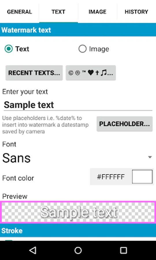 • To import custom fonts copy up to 20 TrueType or OpenType fonts to folder "addwatermark/custom_fonts" on your device.