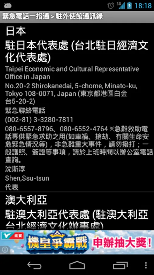 同時,本軟體也包含了中華民國駐世界各地的外館電話和連絡方式(不支援手機直播),萬一護照掉了或者需要緊急救助,也可以馬上透過「緊急電話一指通」的內建通訊錄,在海外找到援助不害怕!
