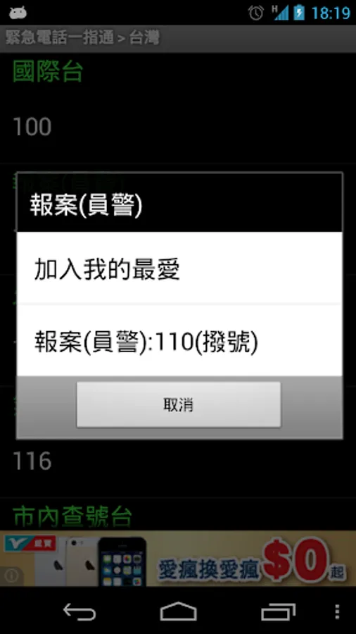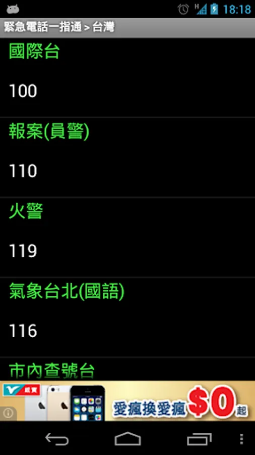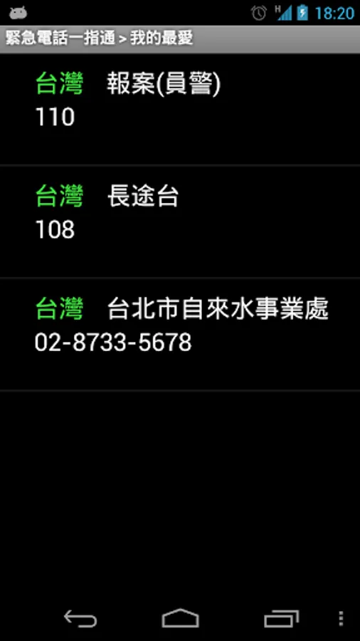 而且為了方便手機使用者,「緊急電話一指通」還有「我的最愛」的功能,讓您把常去的國家或地區的緊急電話設為我的最愛,本軟體最適合經常出國旅遊或是洽公的民眾,只要有了「緊急電話一指通」,出門在外更多了一份保障喔!