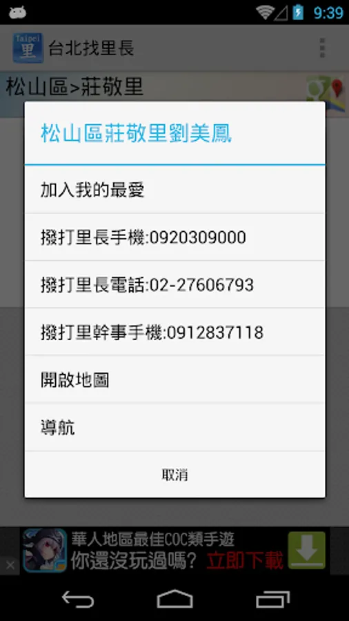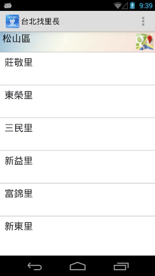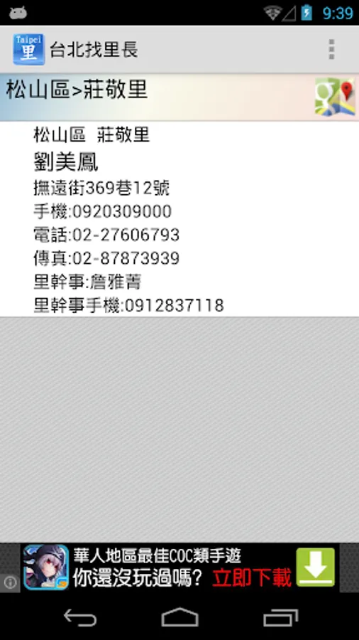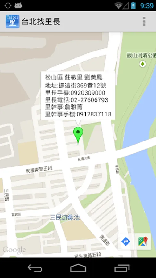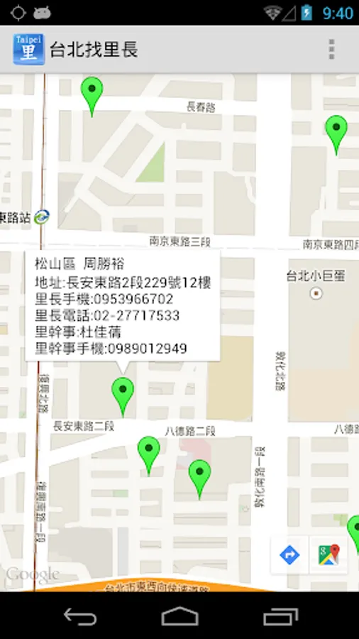下載後,你可以依照台北市12個行政區來選擇,再挑選所在地的里別,最棒的是,「台北找里長」APP的資料完備,包括每一位里長的服務地點、電話、傳真以及手機全部都有,同時也附上google地圖,還能馬上為您導航。此外,就連里幹事的電話手機也一併附上,保證讓您能在最短的時間內,找到里長為您服務、解決問題。