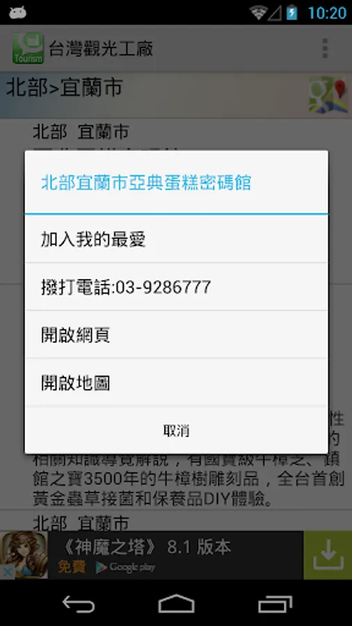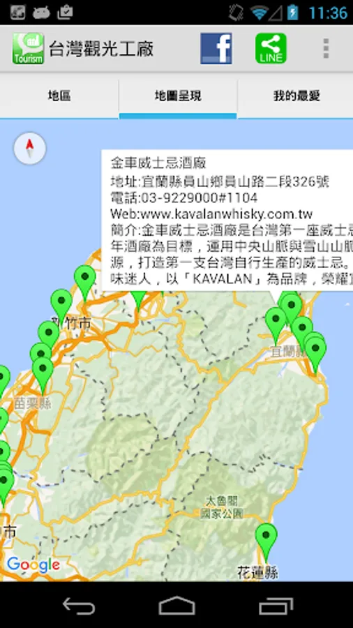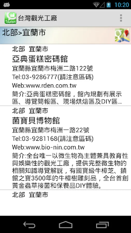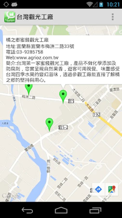 「台灣觀光工廠」 APP下載後,可依照地區縣市來挑選想去玩的地點,資料包括了:觀光工廠簡介、地址、電話以及可以連入官網,當然你也可以把去玩的地點加入「我的最愛」。為了方便使用,還內建google地圖,還能馬上為您「導航」,實在是非常方便又實用!