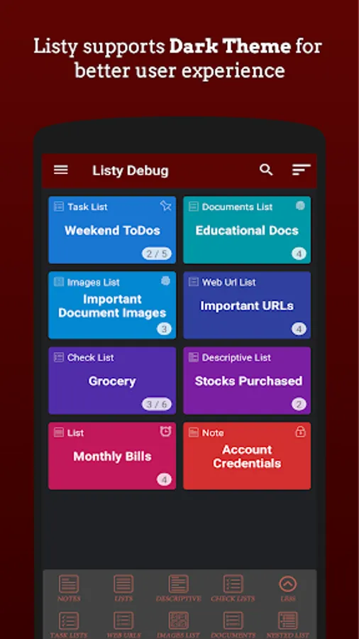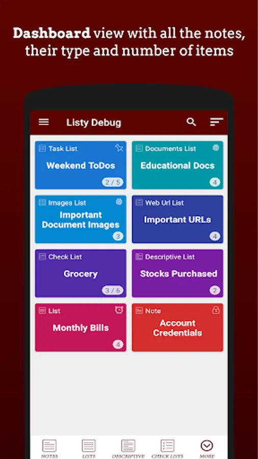 With LISTY you can save all your simple NOTES, LISTS, CHECK LISTS, TASKS LISTS, WEB URLS LISTS, IMAGES LISTS, DOCUMENTS LISTS and NESTED LISTS.