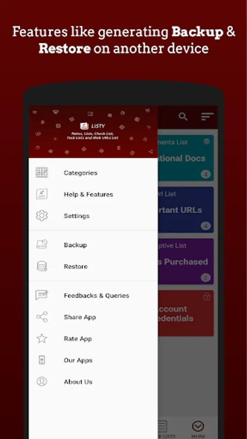 Main feature of Listy is to create CHECKLISTS, where you can create items and check or uncheck them as required. You can also create TASKS LISTS where you can keep your tasks or TO DOs, schedule them as and when you are planning to do these tasks, you can also prioritize your tasks as high, medium or low priority tasks. You can create WEB URLS LISTS where you can save important URLs of web pages, online notes or Facebook pages, etc. Listy provides option to keep your private IMAGES and access them only using the app instead of gallery. You can also store your confidential DOCUMENTS in Listy and can access them directly.