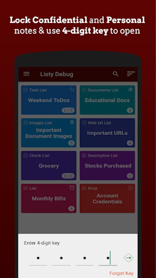 Personal or important notes can be protected and LOCKED by a pin so that other users cannot open them. REMINDERS can be set for the notes as per the requirement. Notes can be PINNED in order to view them on the top. Notes can be easily SHARED with your friends or family via Watsapp, SMS, Mails or other mechanisms. Tasks can be PRIORITIZED and SCHEDULED as per the requirement.