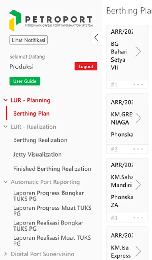 Sebuah sistem berbasis web dan aplikasi mobile yang memiliki fungsi pengawasan, pencatatan, pelaporan serta penentuan rekomendasi keputusan secara digital dan otomatik (automatic decision systems) yang bertujuan untuk meningkatkan kinerja bongkar muat Pelabuhan Petrokimia Gresik.