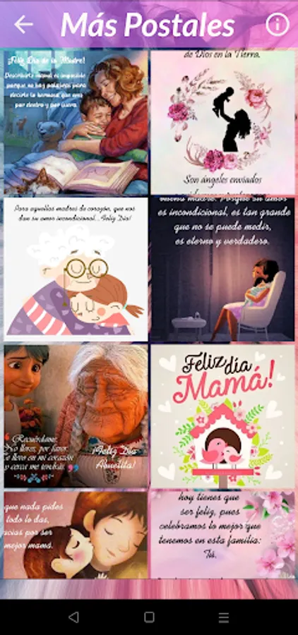 In this application we have created a beautiful collection of cards especially to congratulate mothers on their day, personalized for grandmothers, sisters and much more. If you want to personalize your greeting for Mother's Day, you can accompany it with the best images and phrases that we show you in this app. All these postcards have been designed with a variety of impressive themes based on movies, novels, and portraits with a phrase of love for our mothers that demonstrate the importance of this day.