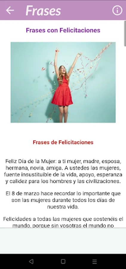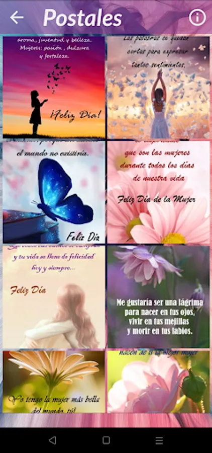 For Women's Day we have created a wonderful collection of postcards with congratulations, phrases and dedications to share through messages or greetings. In this app we want to invite you to discover Here we leave you a selection of original phrases to celebrate this important day. Phrases and images for empowered, fighting, motivating and inspiring women who give meaning to our day to day with Messages and expressions to thank women for their existence, company, presence, dedication and love. Images with poems to send or share with a mother, wife, friend or partner.