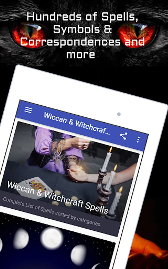 This Witchcraft App offers hundreds of free witchcraft spells, wicca symbols, correspondences, and many other information about Wicca and Witchcraft Spells.