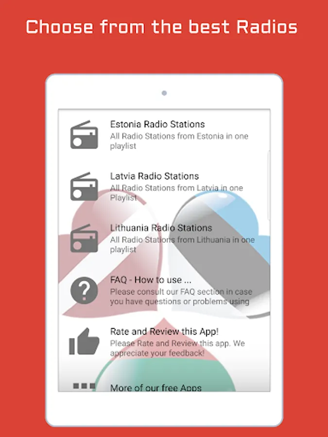 Get access to over 60 Radio Stations from Latvia, Estonia and Lithuania.