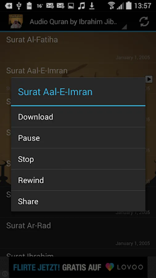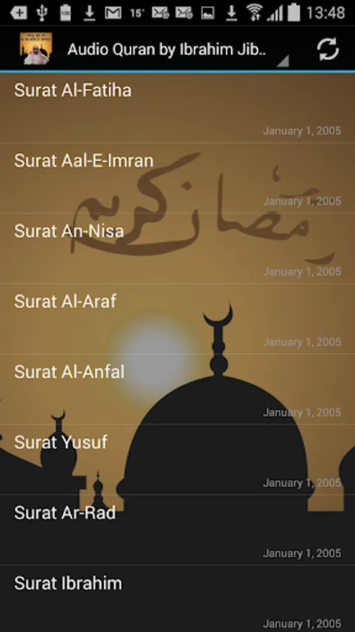 This App contains most of the Qur'an Karim (some Suras are not available at this time, but will add them as soon they become public) in High Quality MP3 audio by the famous Quran reciter Sheikh Ibrahim Al Jibrin