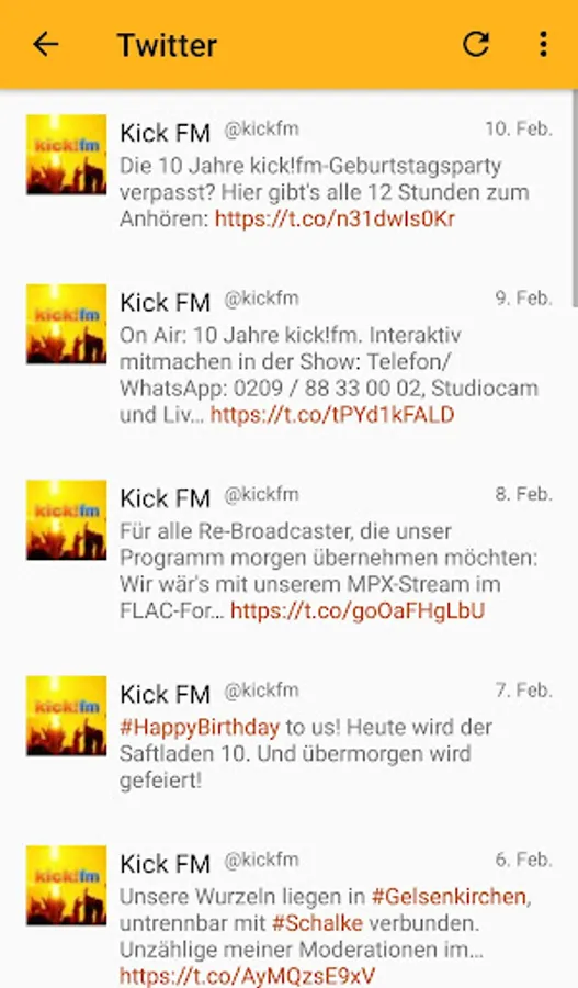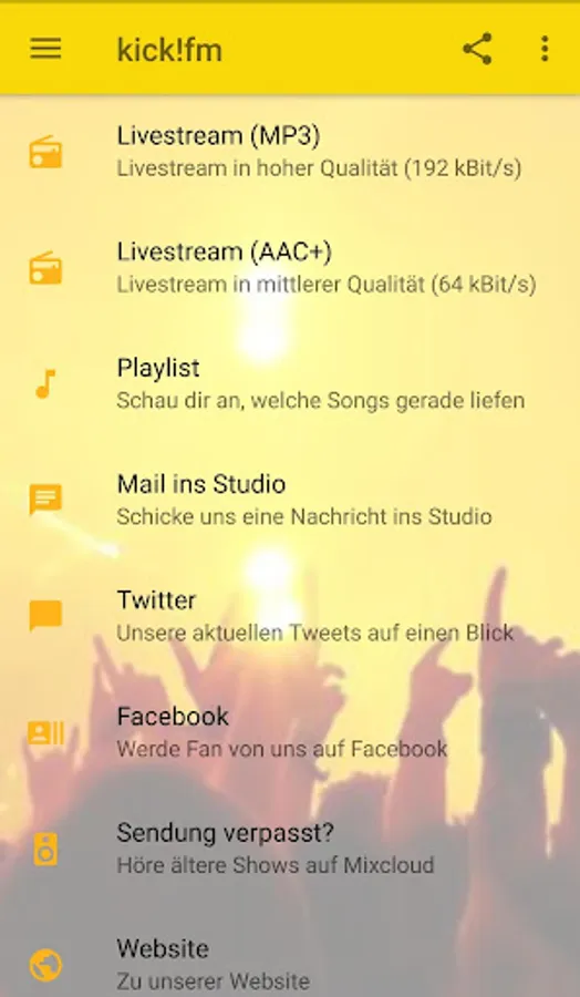 With our Android app you have kick! Fm always with you - listen to the kick! Fm livestream in 2 quality levels, learn news from kick! Fm on Facebook and Twitter or send a mail directly to the studio.