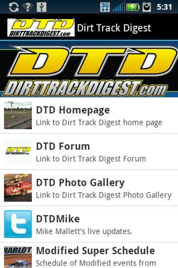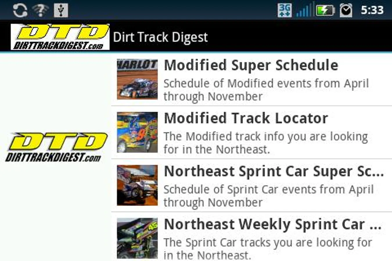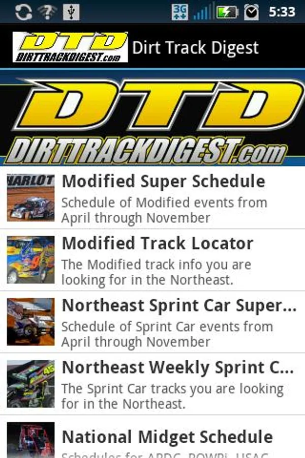 Includes information pertaining to Northeast dirt racing. It also includes a live update Twitter feed, race track locator, information about speedways in the Northeast and a master schedule including most major events in dirt racing in the Northeast. Links are included to the Dirt Track Digest homepage, forum as well as the photo gallery.
