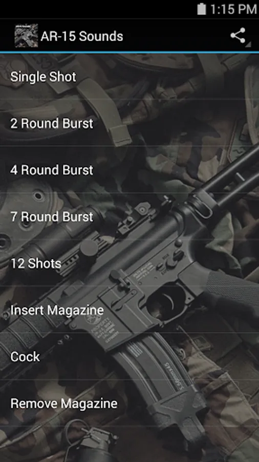 Are you ready to hear what an AR-15 rifle sounds like? This app includes a collection of sounds you would hear when firing and reloading an AR-15. You don't need to go to the shooting range to hear this gun fire! Just download this app and listen to an AR-15 directly from your phone. These sounds can even be shared with friends or used as ringtones!