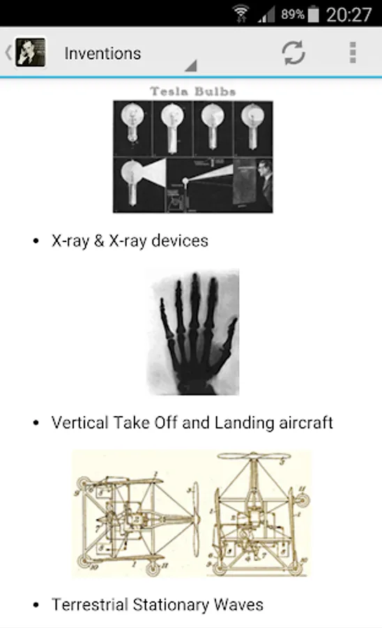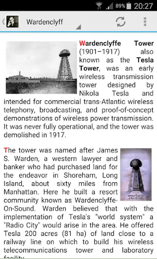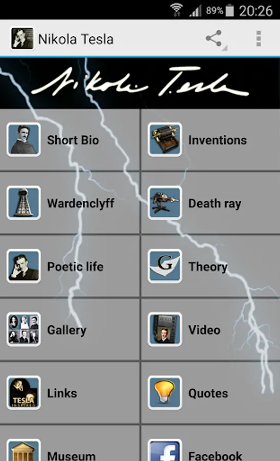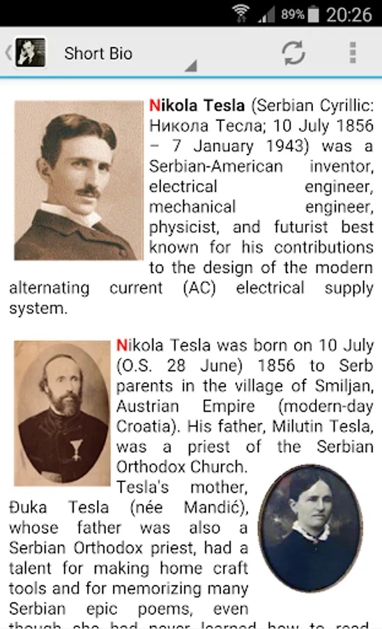 The main purpose of this application is to learn you and give you basic information about life and time of greatest inventor and scientist of all time Nikola Tesla throughout biographical and scientific data. Nikola Tesla is genius who lit the world and through the work in Colorado Springs and Long Island with Experiments with Alternate Currents of High Potential and voltage, he give to world light and modern technology. His basic field of researching was electricity but through this field he left traces in many others, he was multidisciplinary scientist.