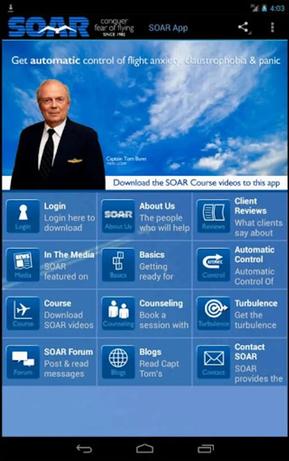 SOAR – established in 1982 - has opened up the world to 10,000 fearful fliers. Now available as an app created by the leading authority on flight phobia: author, airline captain and licensed therapist Tom Bunn, M.S.W., L.C.S.W.