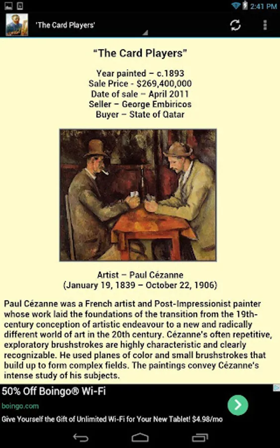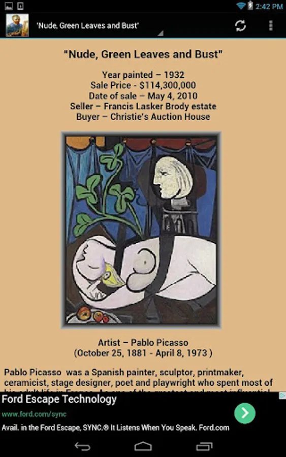 Cezanne has but one entry into this prestigious group, albeit, it is the most costly having been sold for nearly 270 million dollars. Four of Picasso’s works are in this elite club with a total value in excess of 500 million dollars.