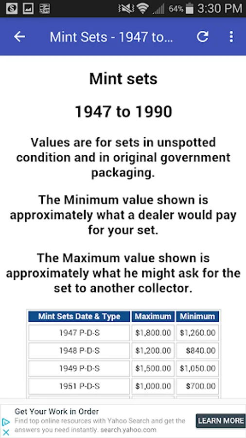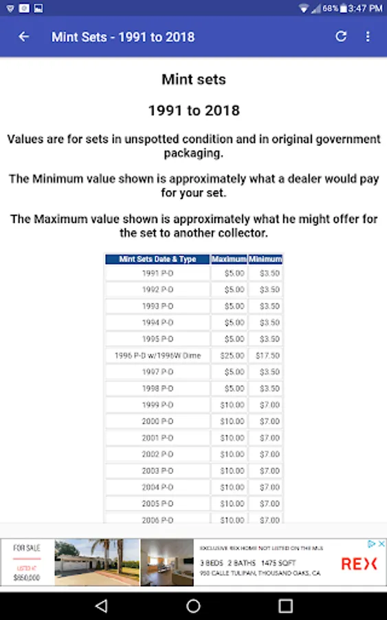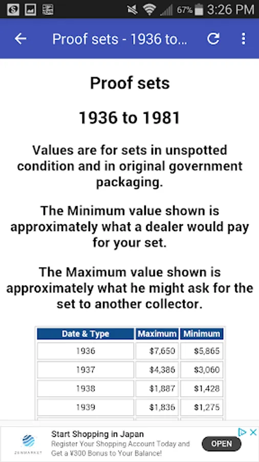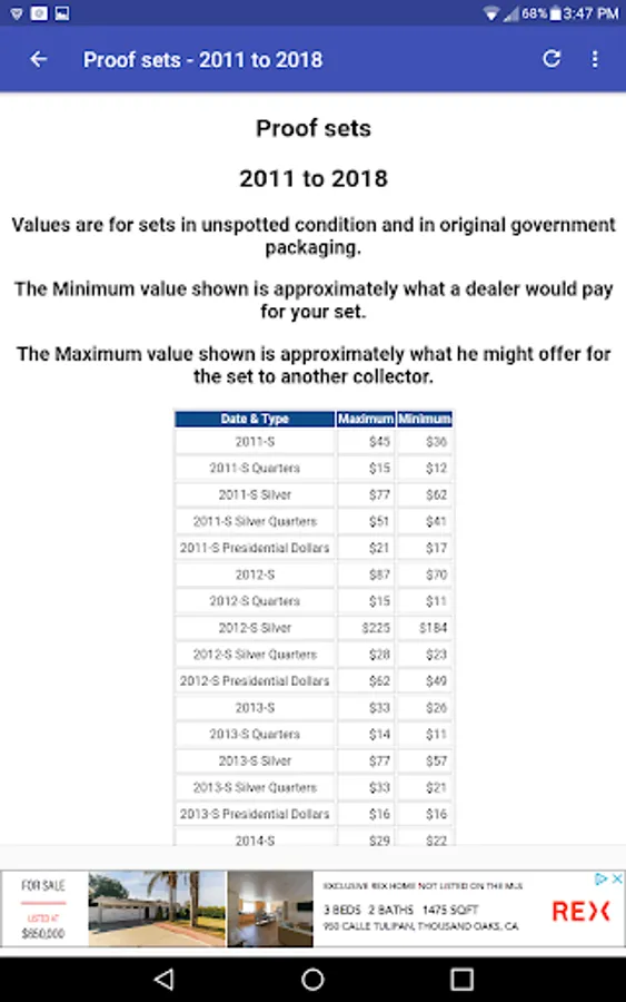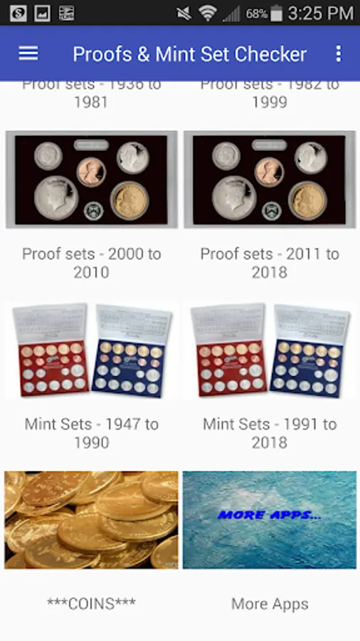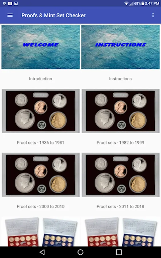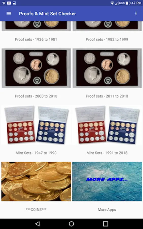 All United States Proof coin sets from 1936 to the present and all Mint sets from 1947 to the present are listed and evaluated in this application. Determine the value of your collection simply and quickly with the tables presented.