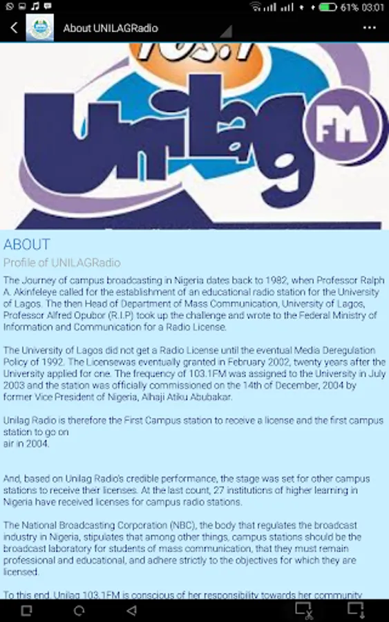 The Journey of campus broadcasting in Nigeria dates back to 1982, when Professor Ralph A. Akinfeleye called for the establishment of an educational radio station for the University of Lagos. The then Head of Department of Mass Communication, University of Lagos, Professor Alfred Opubor (R.I.P) took up the challenge and wrote to the Federal Ministry of Information and Communication for a Radio License.
