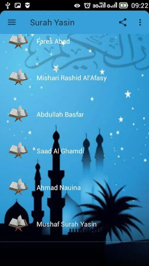 A light application entitled 'Surah Yasin surah Yasin'berisi readings from various world renowned qori like Fares Abad, Mishari Rashid Alafasy, Abdullah Basfar, Saad Al Ghamdi, Ahmad Nauina This application is also equipped with a Mushaf Al Quran Surah Yasin, making it easier to read tajwidnya.