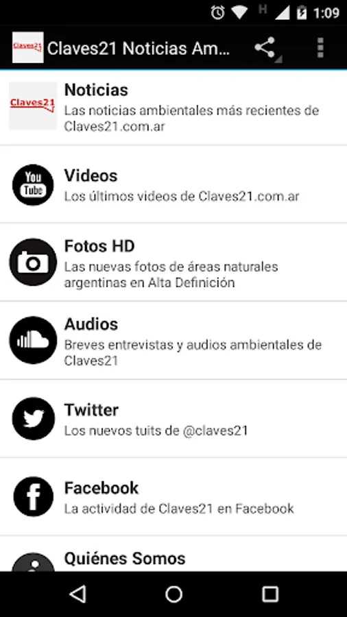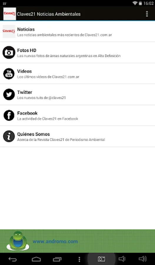 Key 21 provides environmental news from Argentina and the world and other content constantly updated as pictures of landscapes in HD Argentine natural areas and videos with interviews concerning sustainable development and ecology. This is a free app environmental journalism.