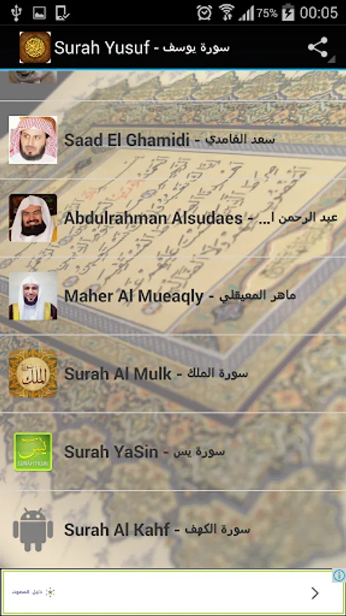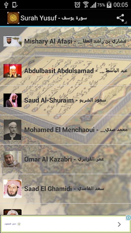 This application offers multiple readings of Surah Yusuf by the angelic voices: Abdulbasit Abdulsamad, Omar Al Kazabri, Mishary Al Afasi, Abdulrahman Alsudaes, Saud Al-Shuraim, Mohamed El Menchaoui, Saad El Ghamidi and Maher Al Mueaqly.