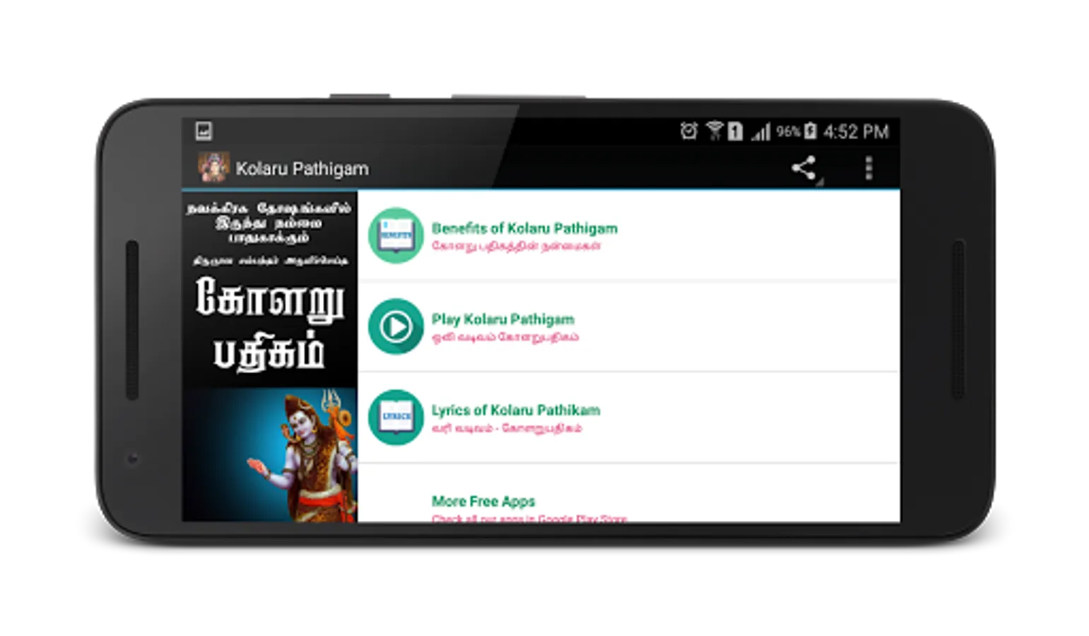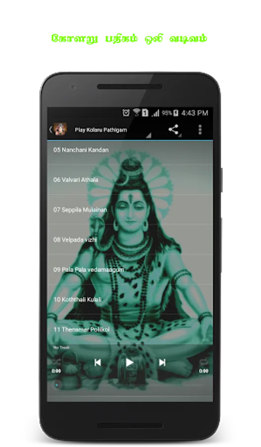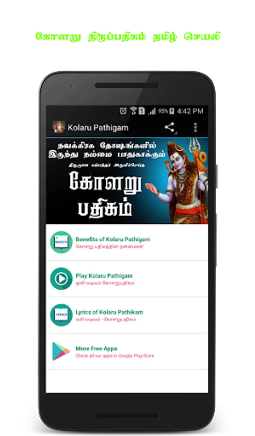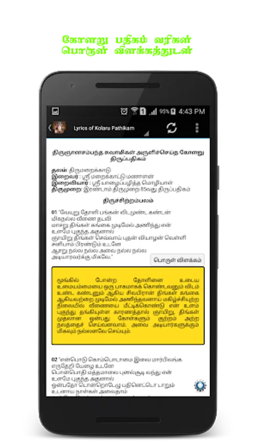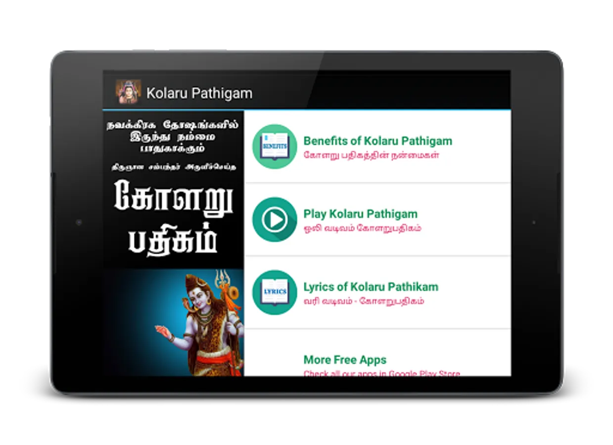 This app has lyrics of 11 poems of kolaru pathigam and audio song of Kolaru Padhikam sung by DR. Seergazhi Govindarajan.