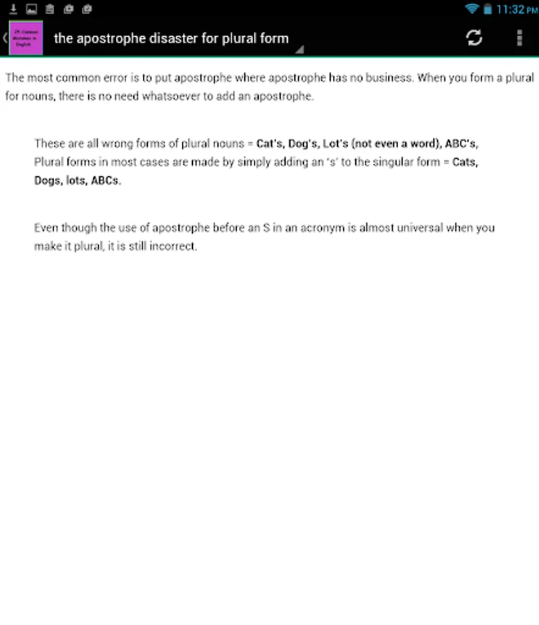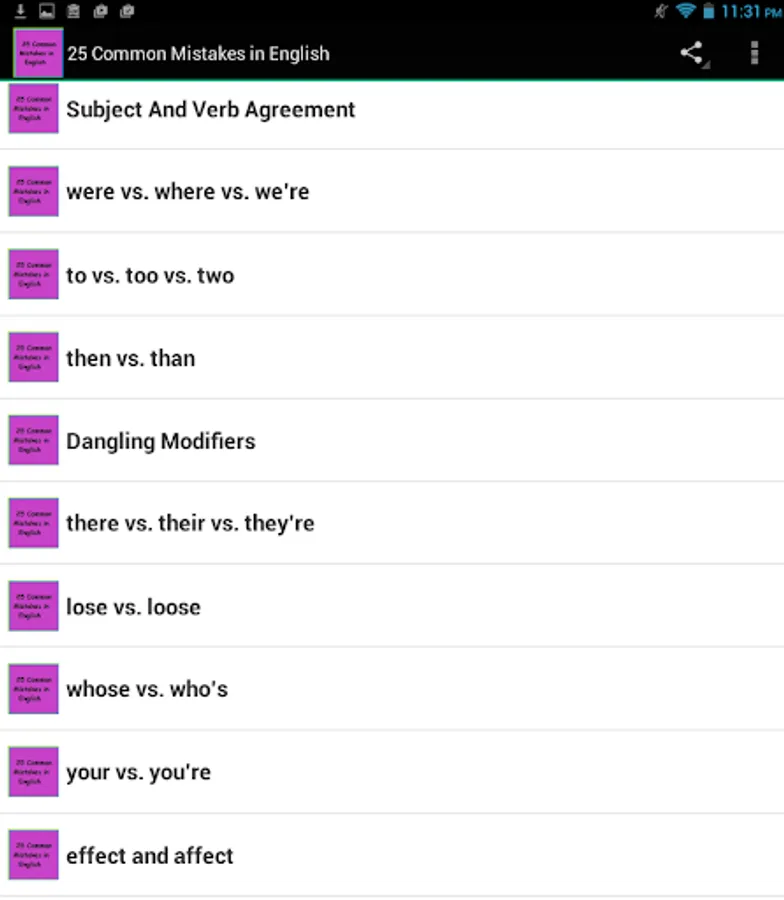 This Android app discuss about 25 common errors that a lot of people make while using English language. The goal of this app is to help those people who wants to enrich their English language knowledge. Reading these 25 instructions, we can avoid a lot of error while English as a foreign language.