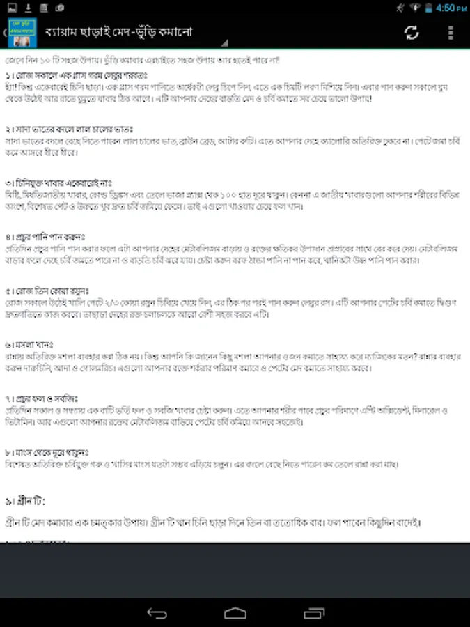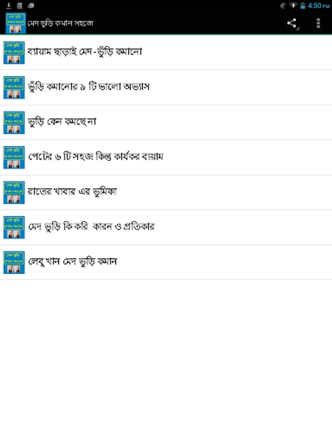 "Med Vuri Koman Sohoje" is a Bengali Android app which provides effective information about how to reduce unwanted belly fat by following some super simple and easy food habit and exercise.