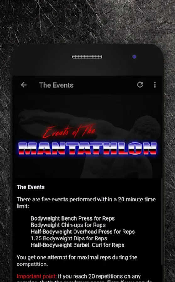 The events are bench press, chin ups, overhead press, dips and barbell curls.