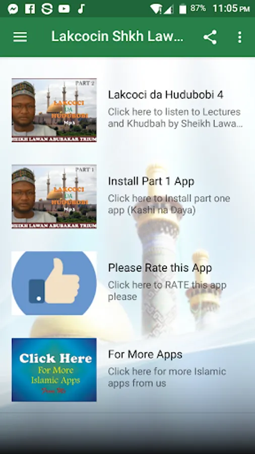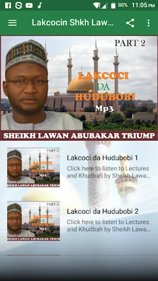Wanna application mai suna "Lakcocin Sheikh Lawan Abubakar Triump Kano Part 2" na kunshe da Lakcoci da Hudubobi daga bakin Sheikh Lawan Abubakar Shu'aib Triump, Kano Nigeria. Application din na kunshe da lakcoci da hudubobi kusa guda 40, sannan kuma OFFLINE ne.