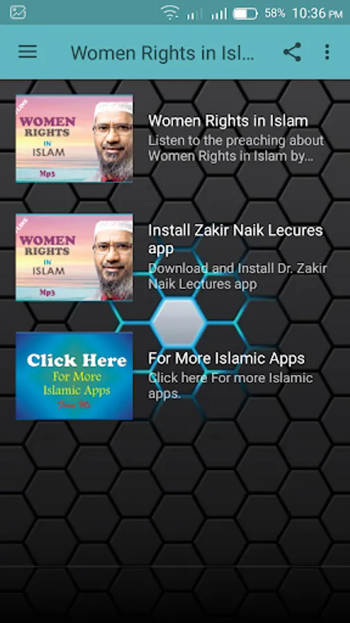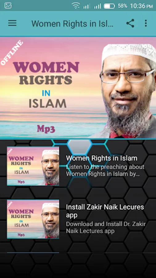 This application brought you the "Women Rights in Islam" lecture by Dr Zakir Naik.. The application is perfectly offline. Once you install it, you will enjoy unlimited listening to these preaching for free.