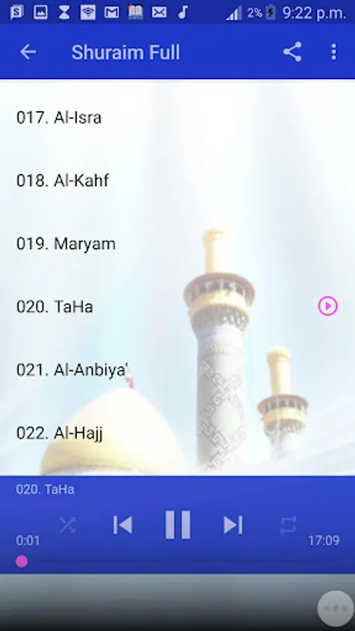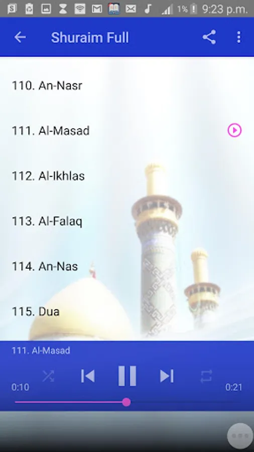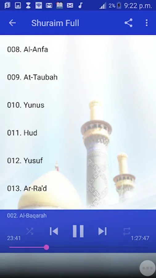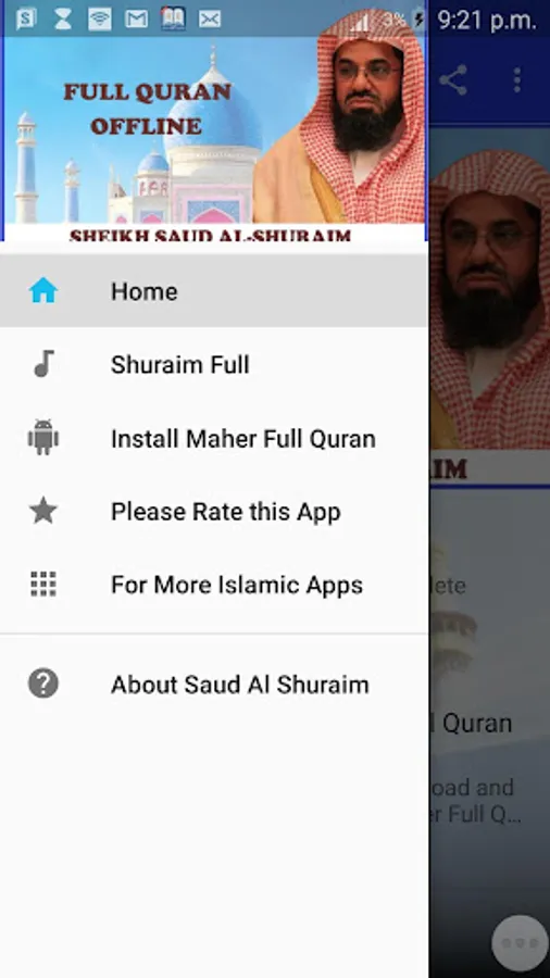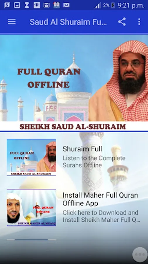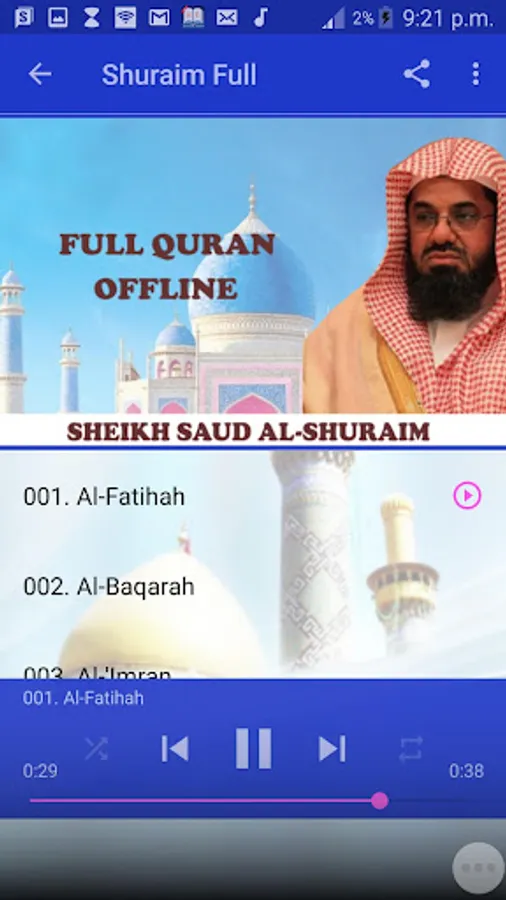 This application brought you Holy Quran mp3 offline recitation by Sheikh Saud Al-Shuraim. With this application you can listen to any Surah OFFLINE for free without the need of internet connection. Download, Install and enjoy the app.