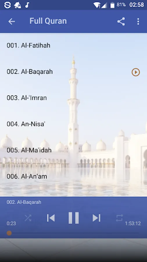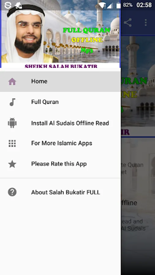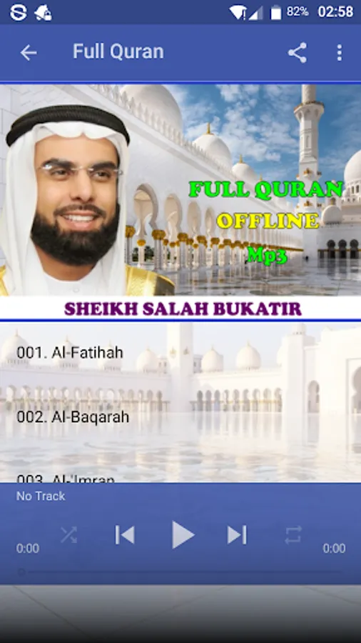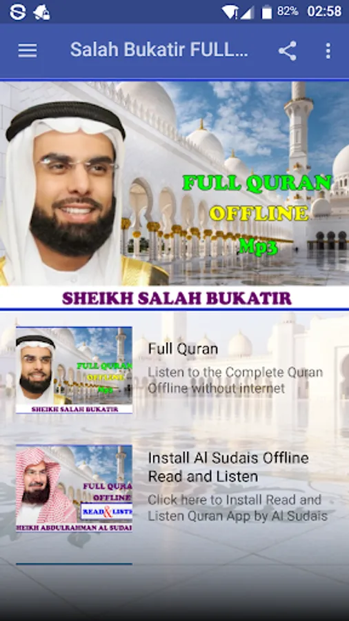 This application brought you Holy Quran mp3 OFFLINE recitation by Sheikh Salah Bukatir. With this application you can listen to any Surah offline for free without the need of internet connection. Download, Install and enjoy the app.