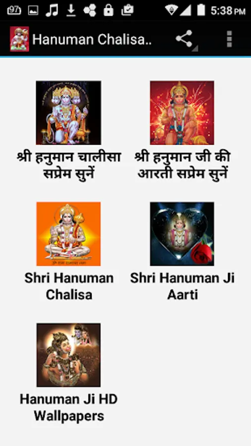 You will be happy to see such a nice collection of Hanuman ji Wallpapers in one single application with Hanuman Chalisa in Video and Mp3 and also includes Hanuman ji ki Aarti in Video and Mp3.