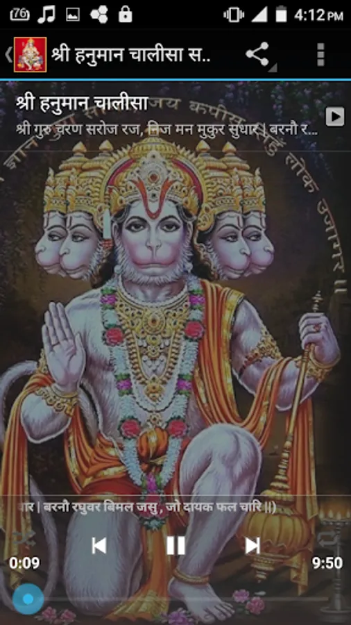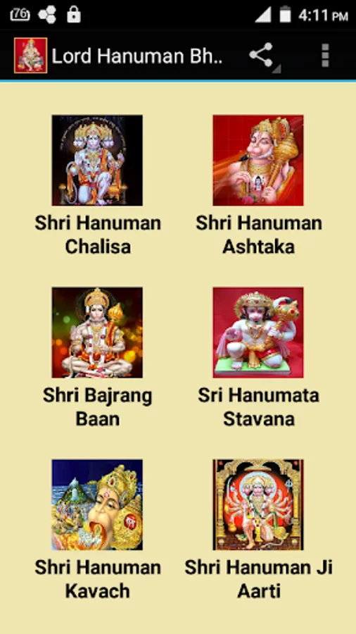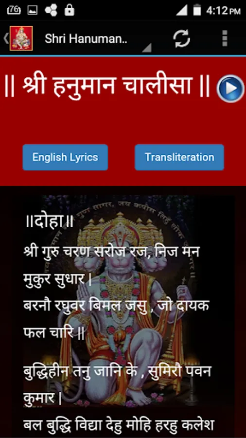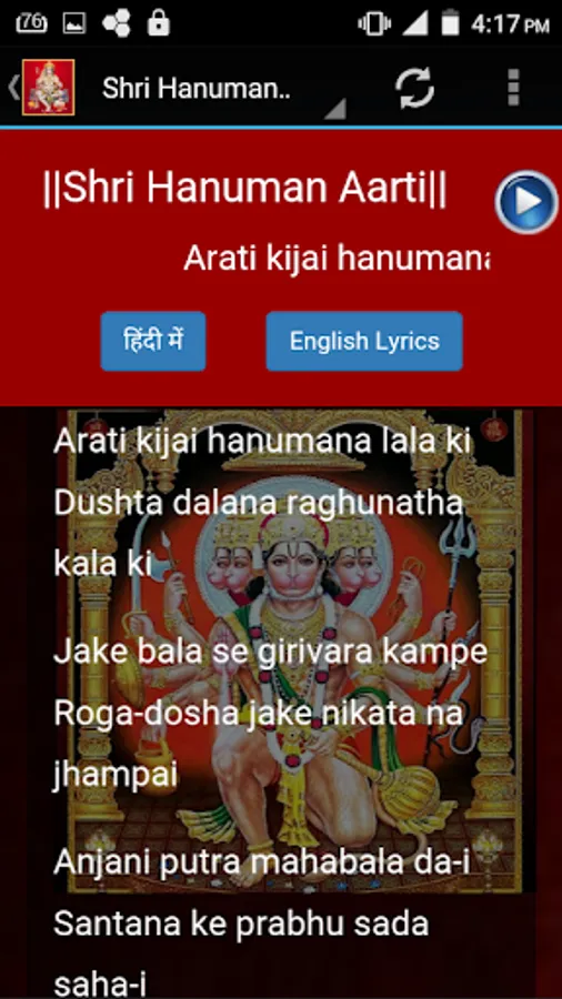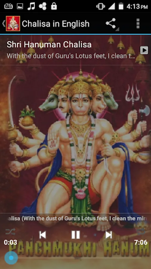 You will be happy to see such a nice collection to Read & Listen the Chalisa, Sankatmochan Astak, Bajrang Baan, Stavana, Kavach and Aarti in one single application with Lyrics Video and Mp3.